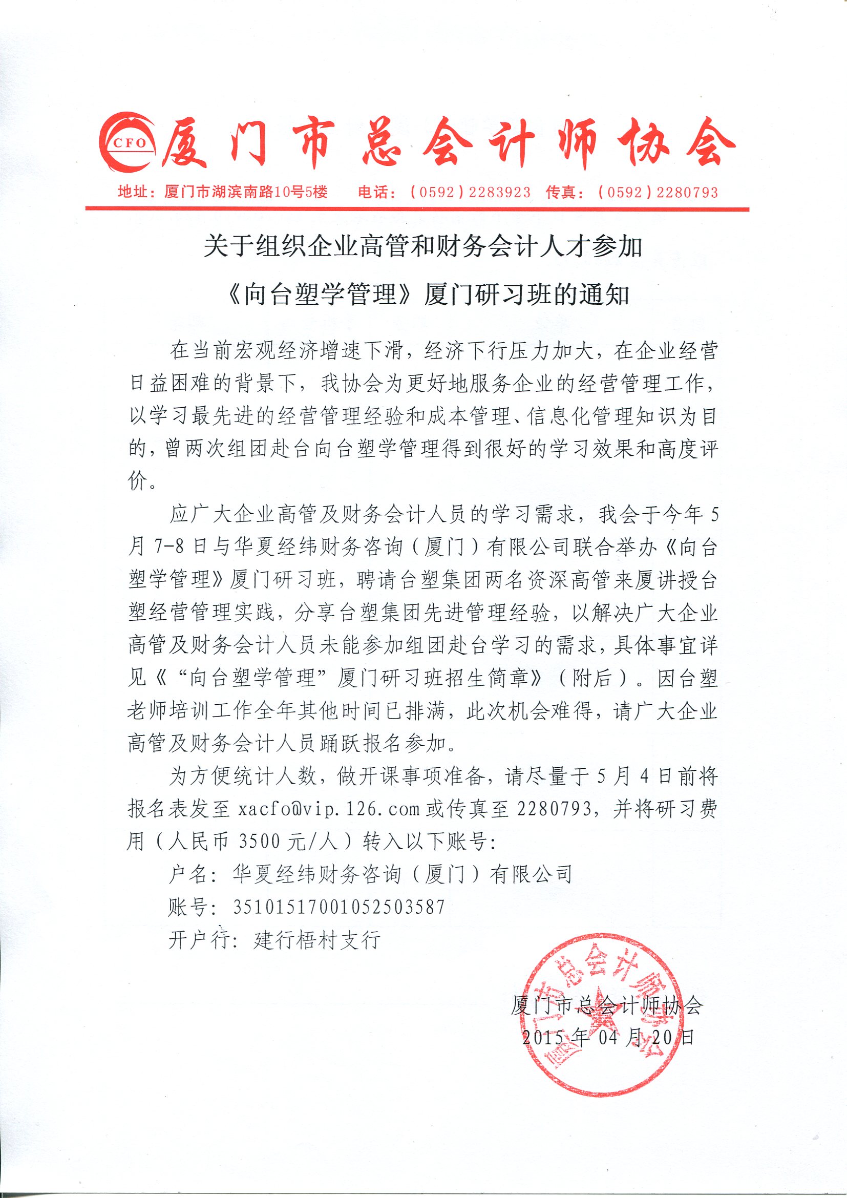 關(guān)于組織企業(yè)高管和財(cái)務(wù)會計(jì)人才參加《向臺塑學(xué)管理》廈門研習(xí)班的通知